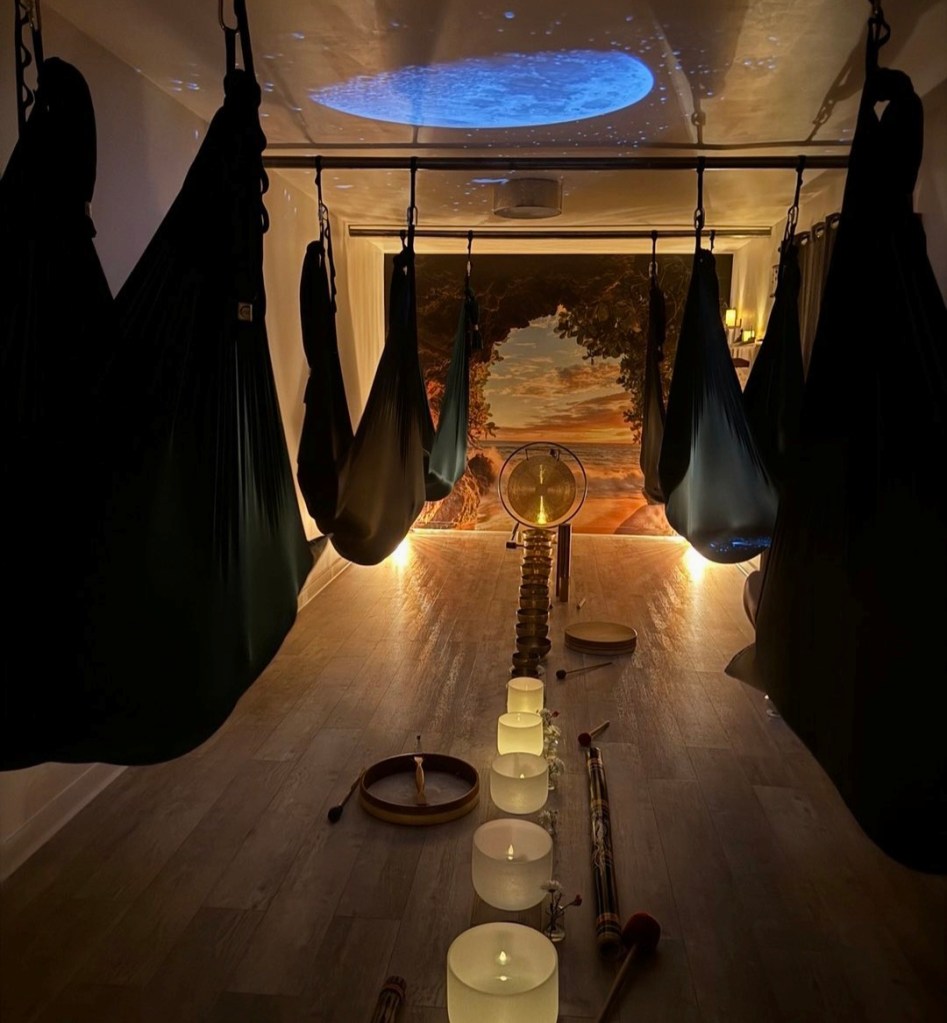 - La seconde partie est pleinement relaxante : étirements lents dans le tissu, postures restauratives et un voyage sonore flottant pour libérer les tensions physiques et émotionnelles. Les instruments vibratoires enveloppent le corps et apaisent profondément l’esprit.